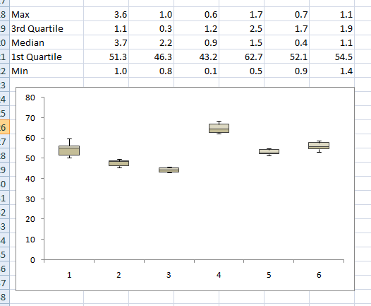 Since the previous entriesI have recieved quite a few questions about Box-plots in Excel 2007, so I decided I should describe one way to create decent looking box plots in Excel 2007. In my example I start with a set of data containing six samples with ten replicates each, and from this I want to create a box plot showing the extremes, median and the quartiles.